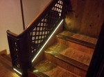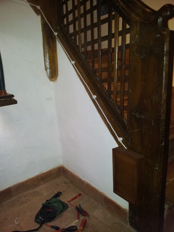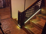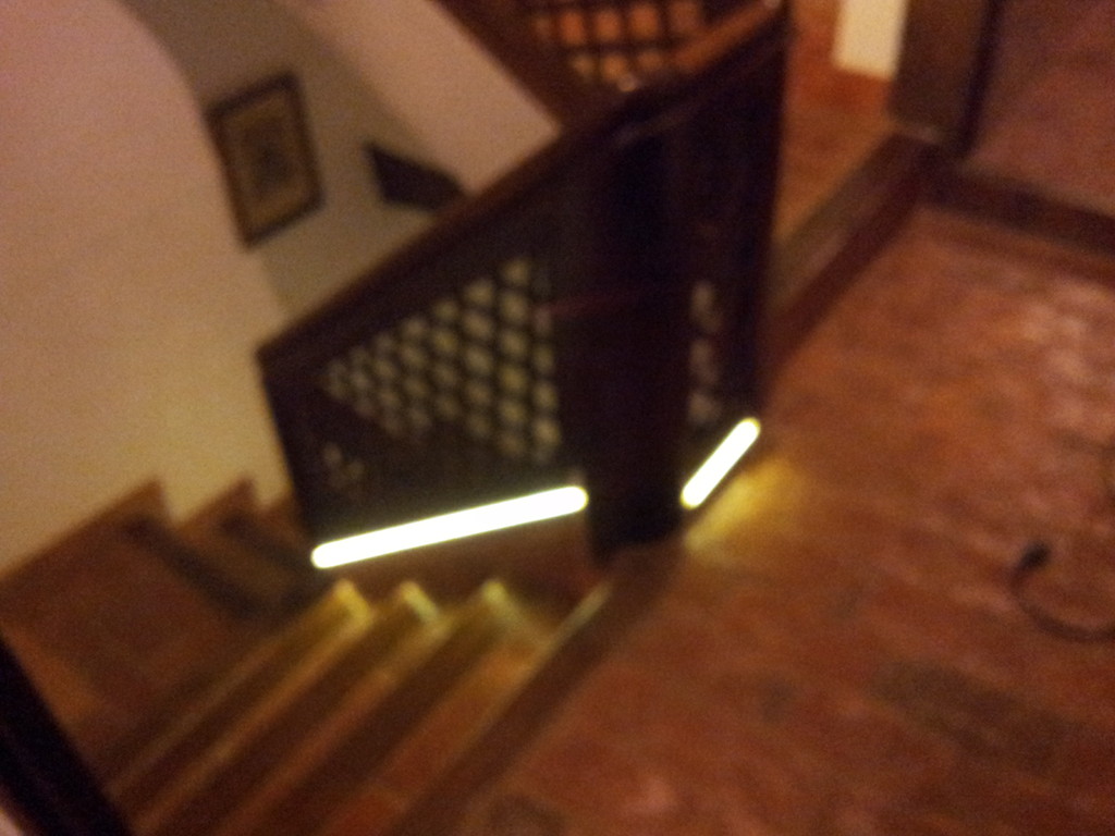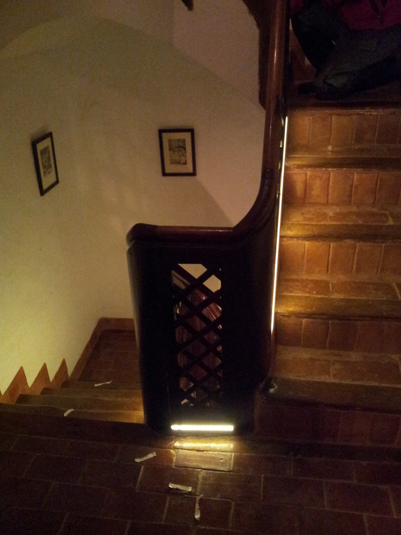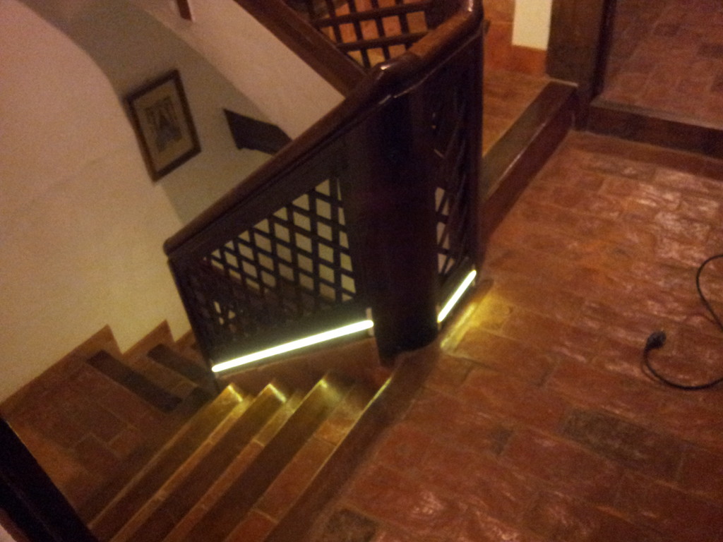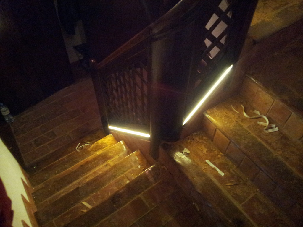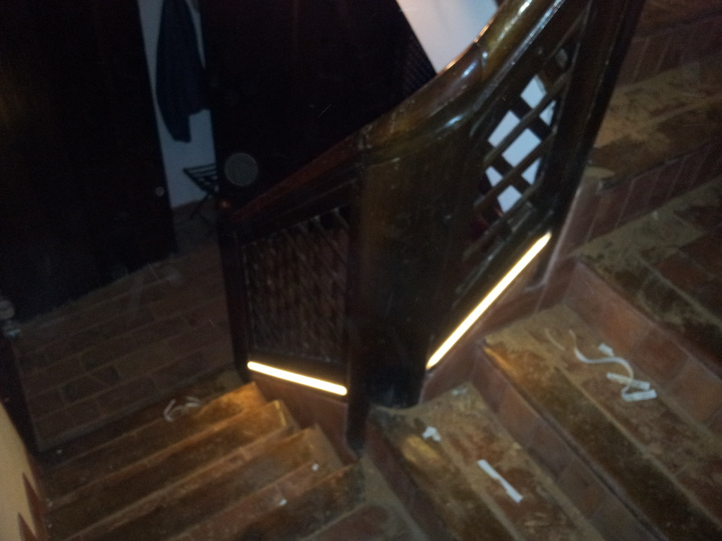 Se ha conseguido dar un ambiente más vanguardista en una de las zonas comunes de una vivienda construida en 1518, con esta iluminación led conseguimos un ambiente cálido y una buena visibilidad en las pisas de la escalera, el sistema led instalado queda totalmente integrado sin romper la estética rustica de la vivienda. Instalación realizada con perfiles de aluminio encastrables con tapa translucida y tiras led SMD 5050 cálidas a 24V.